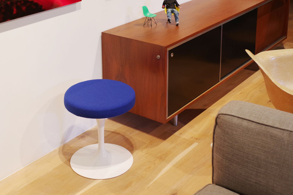 イームズやネルソンと並んでアメリカのミッドセンチュリーデザインを支えたフィンランド人建築家、エーロ・サーリネンが1957年にデザインしたKnoll社のチューリップスツールです。ブルーファブリック座面のモデルになります。