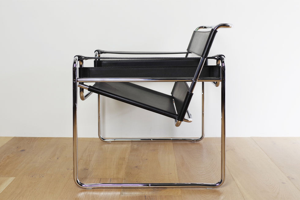 自転車の製法からヒントを得て、世界で初 めてスチールパイプを椅子のフレームに用いたことでも有名です。複雑に交差したフレームに厚い本革を渡すことで背もたれ・肘掛け・座面を構成し、当時としては非常に前衛的なデザインだったことが伺い知れます。