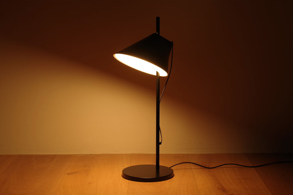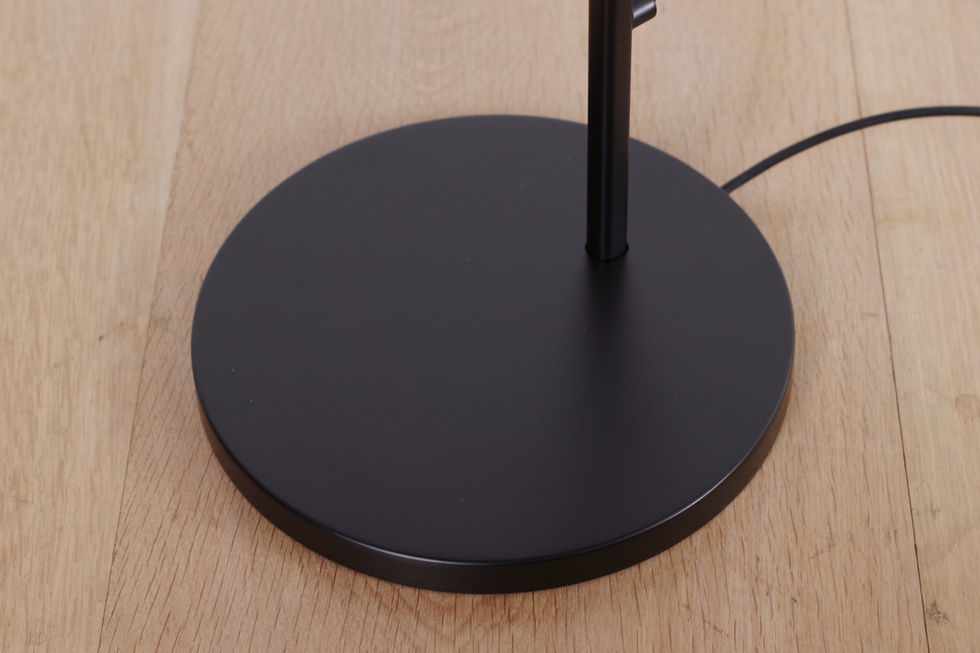 支柱を貫通したシェードは昇降、回転、傾斜とあらゆる方向にフレキシブルに動かすことがで き、支柱トップに備わったスイッチでON/OFFができます。またスイッチを長押しすることで光量を無段階に調節できる調光機能も搭載されています。ベースはアルミダイキャスト製でずっしりと重く安定感のあるテーブルランプです。